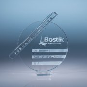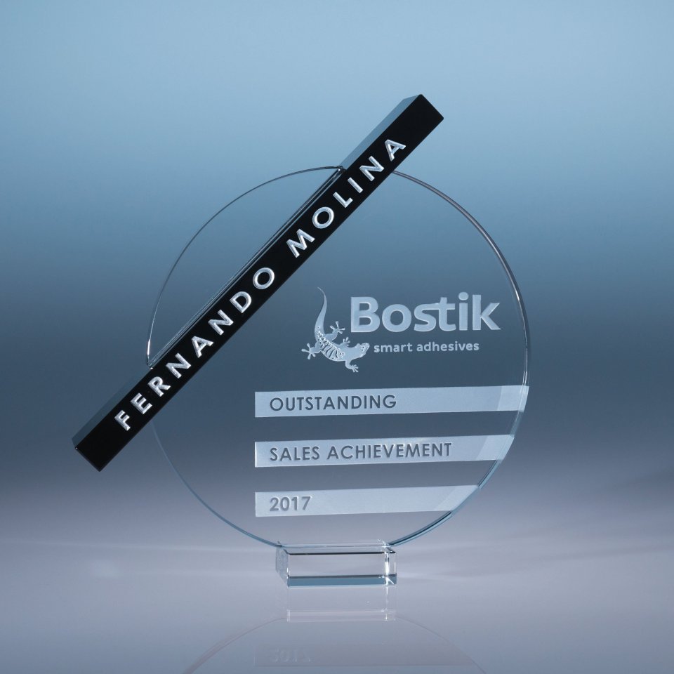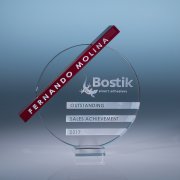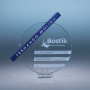 This dynamic award grabs attention with its angled bar that serves as the perfect way to highlight one's name. Choose clear, blue, red or black optic crystal. Secondary etching location included as shown. Color-fill not included, add $8.00 ( C )