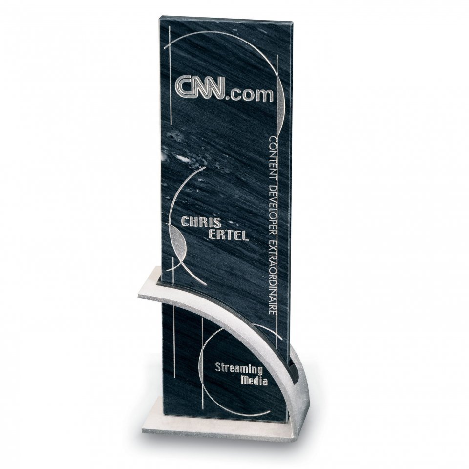 Congratulate those few talented individuals who strive for perfection - always conscientious, always earnest, always making a concerted effort. Quarry has artistically combined an aluminum arc base, with matte finish, and a highly polished monolith of genuine black marble that is decoratively deep carved and color-filled with silver enamel. A fresh modern design guaranteed to enhance and uplist the most imortant people of your organization.